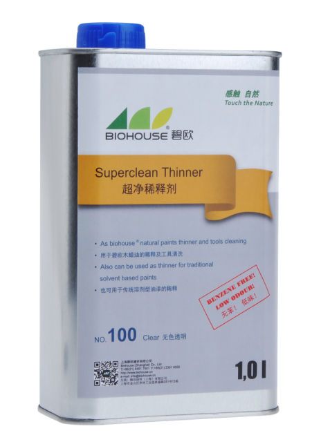 Biohouse? SuperClean Thinner 100 is a low odour and benzene free solvent, can be used as biohouse? natural paints thinner and tools cleaning. Also can be used as thinner for traditional solvent based paint.